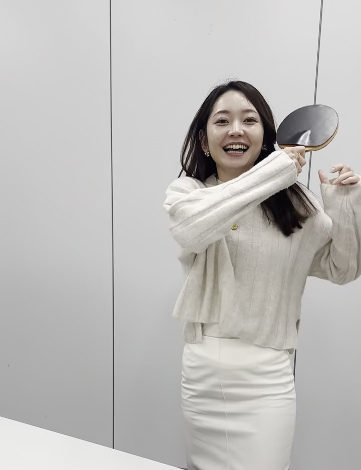 ピチピチなタイトスカートを履いてボールを打ち返す竹﨑由佳アナの腰回りがクッキリと強調されて、下着のラインっぽいのも浮き出ているように見えました! GIF動画&明るさ調整版付きで! [2024年2月12日 テレ東卓球チャンネル]