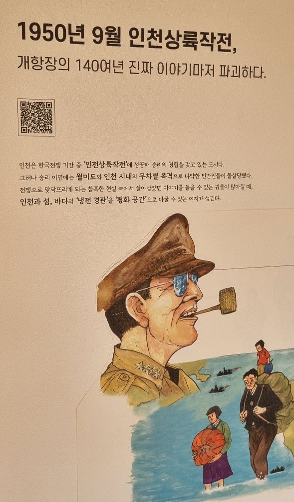 旧仁川市長公邸をリモデリングしたこの建物には、仁川の歴史を絵で説明した「歴史画廊」がある。この中で、仁川上陸作戦を説明したコーナーには「1950年9月 仁川上陸作戦、開港場のおよそ140年の本当の物語すら破壊する」というタイトルの下、「(仁川上陸作戦)勝利の裏で、月尾島や仁川市内の無差別爆撃により無力な民間人が抹殺された」という内容が記されている。パイプをくわえてほほ笑みを浮かべるマッカーサー元帥と、みすぼらしい身なりの避難民の姿を対比させた絵もある。