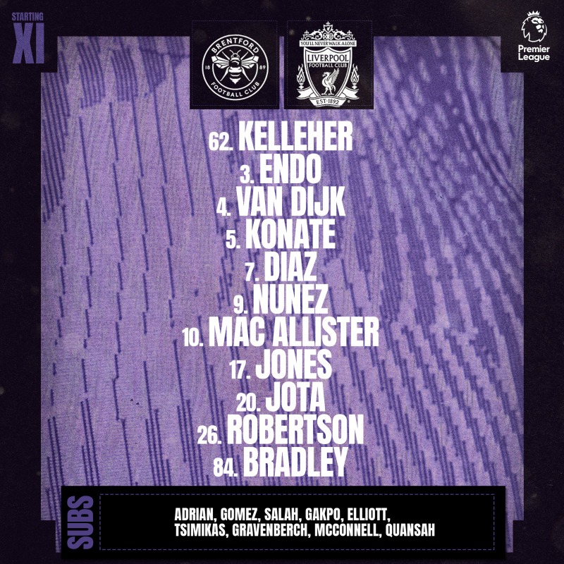 Kelleher; Bradley, Konate, van Dijk(C), Robertson; Mac Allister, Endo, Jones; Diogo Jota, Darwin Nunez, Luis Diaz.