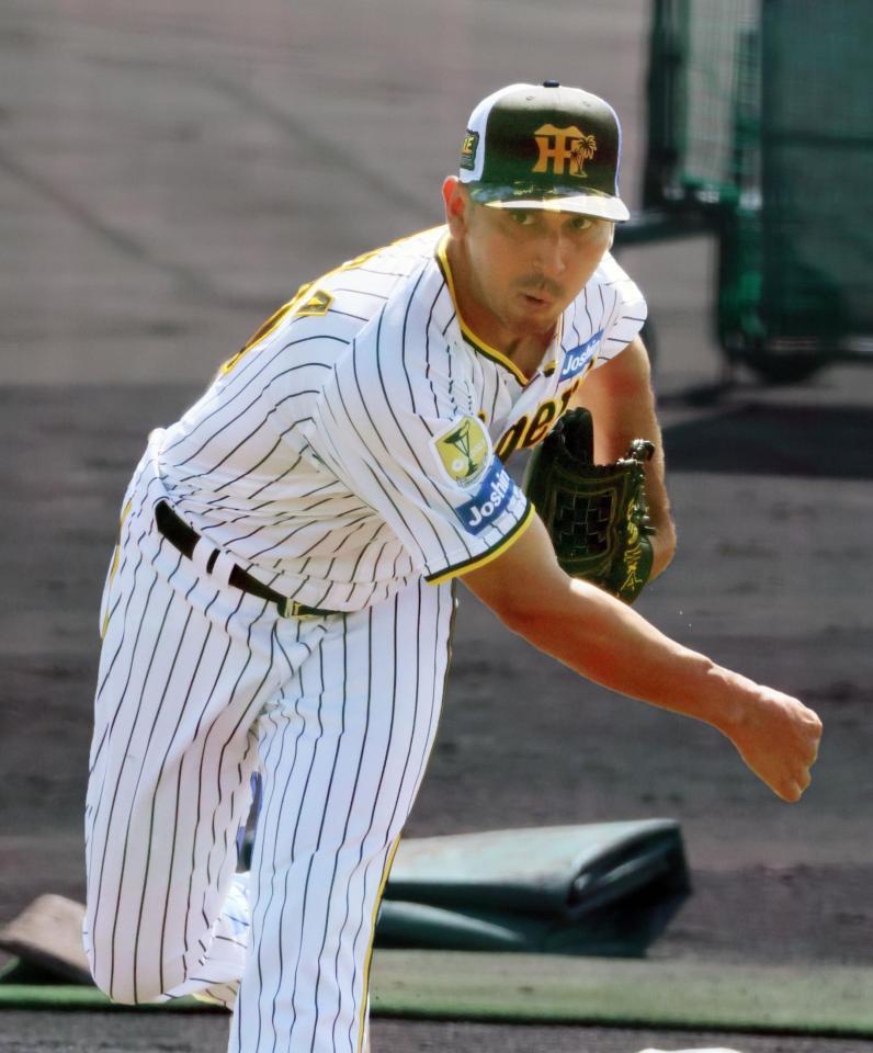 阪神新外国人のハビー・ゲラ投手(28)=前レイズ=が、来日初の打撃投手を務めてミエセス、前川と対戦した。