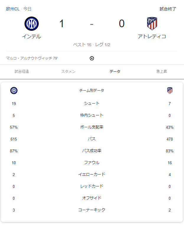 インテル 1-0 アトレティコ・マドリード[得点者]マルコ・アルナウトビッチ(後半34分)インテルhttps://soccer.yahoo.co.jp/ws/category/cl/game/240220001/summary?gk=41