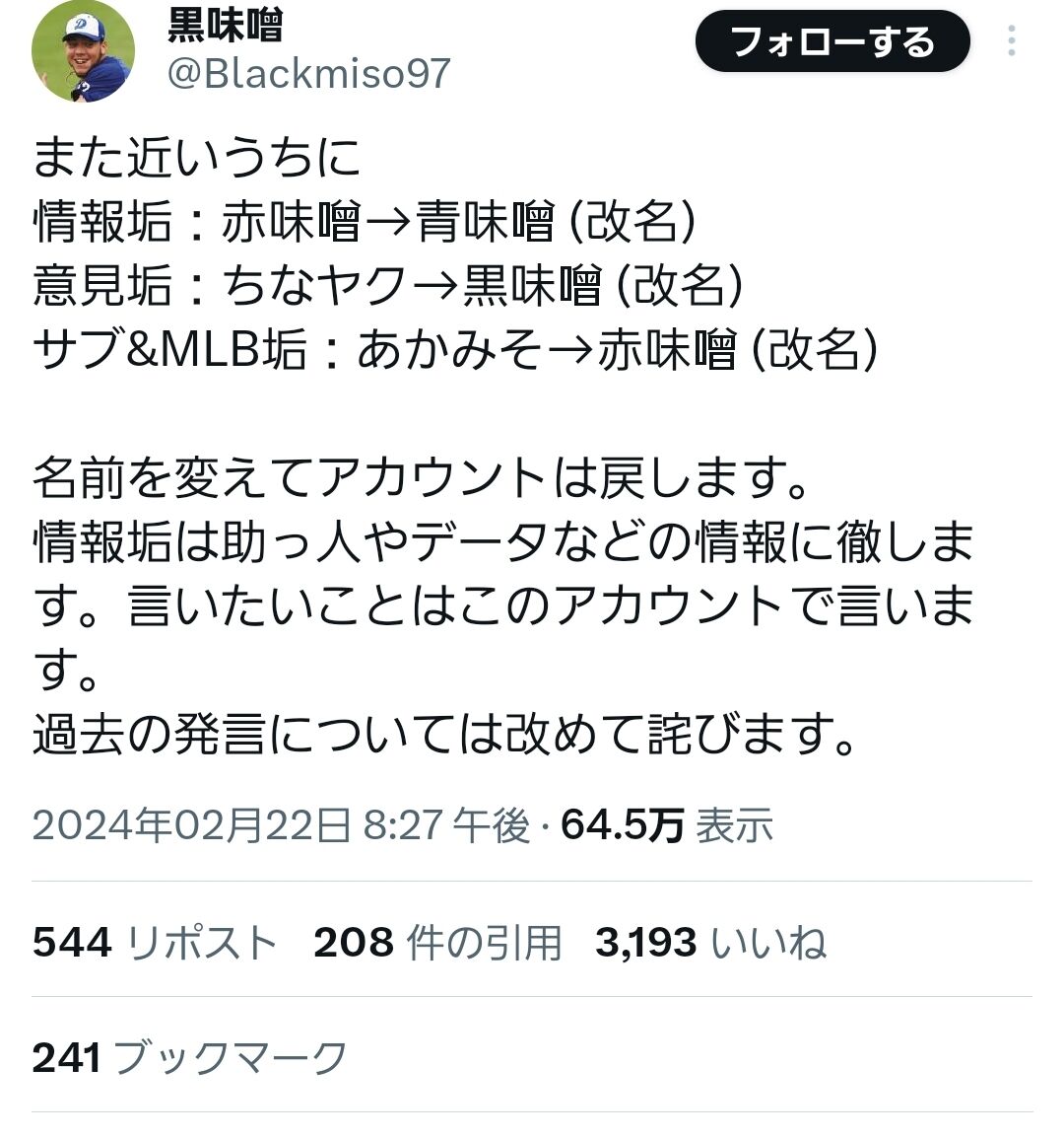 過去の発言については改めて詫びます。— 黒味噌 (@Blackmiso97) February 22, 2024