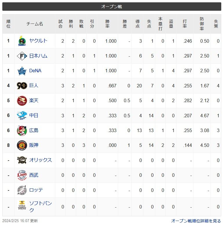 オープン戦順位表(2/25)wxwxwxwxwxwxwxwxwxwxwxwxw