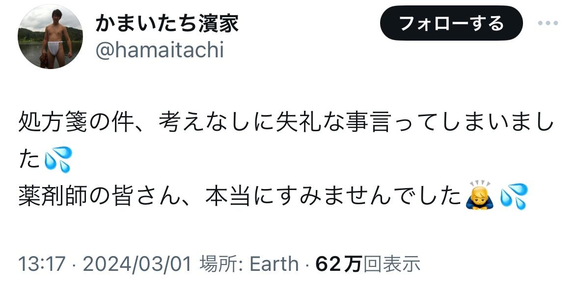 薬剤師の皆さん、本当にすみませんでした🙇♂️💦— かまいたち濱家 (@hamaitachi) March 1, 2024