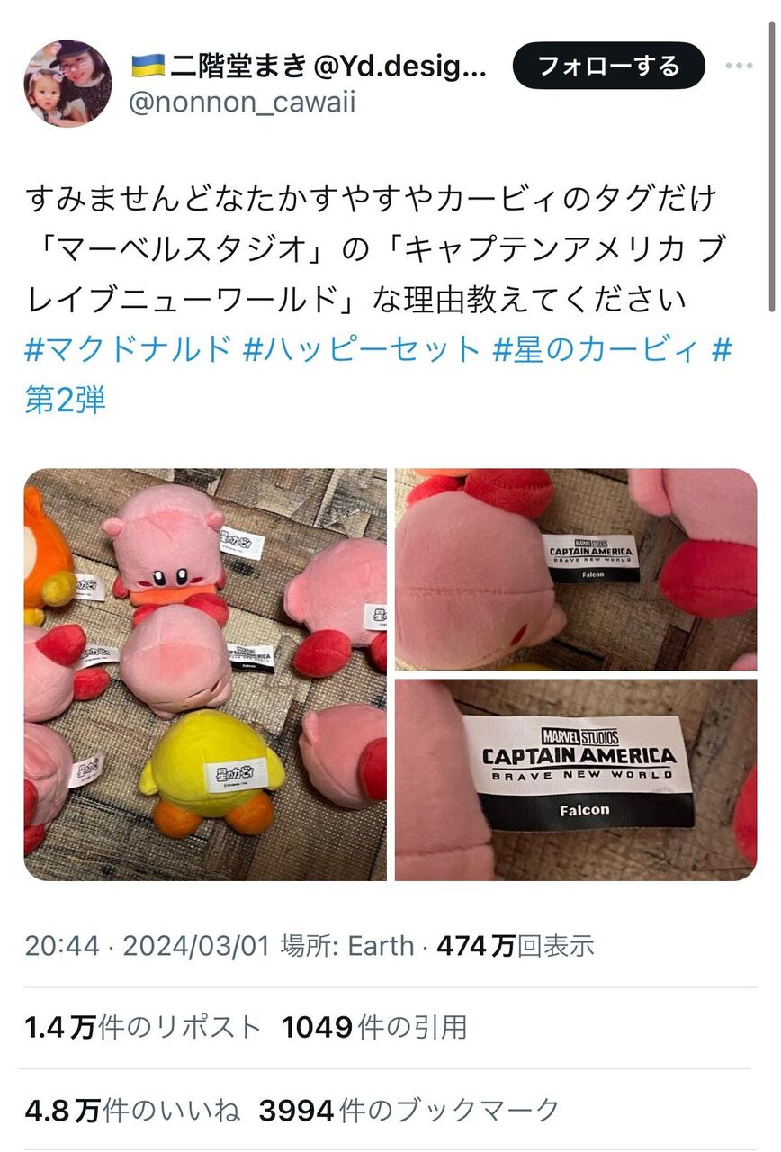 すみませんどなたかすやすやカービィのタグだけ「マーベルスタジオ」の「キャプテンアメリカ ブレイブニューワールド」な理由教えてください#マクドナルド #ハッピーセット #星のカービィ #第2弾 pic.twitter.com/7FEF7udq0S