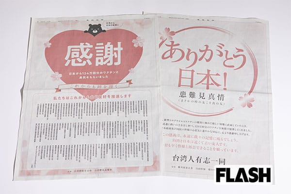 《新型コロナウイルスワクチン124万回分を台湾に無償提供した日本政府と国民に対し、感謝の気持ちを伝えるため、約130の台湾系企業、団体などが共同出資して掲載されたものだ。》