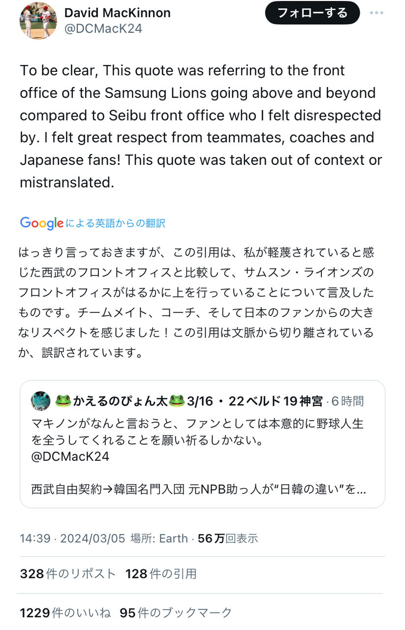 【朗報】マキノンの「日本より韓国のほうが敬意を感じた」発言、西武の選手達に向けたものじゃなかった