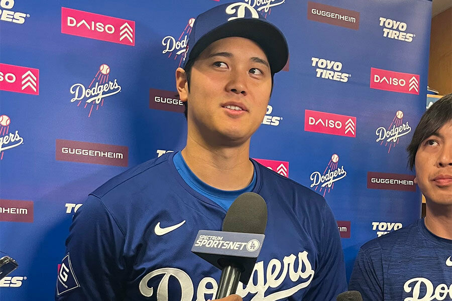 エンゼルス戦後の囲み取材に応じたドジャース・大谷翔平【写真:小谷真弥】