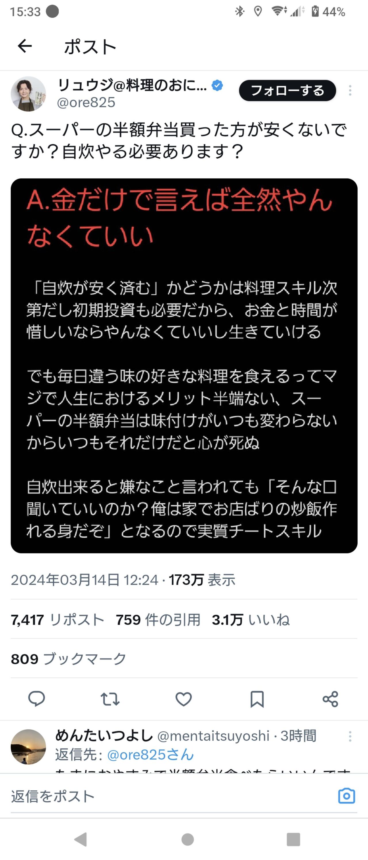 リュウジ氏は「スーパーの半額弁当買った方が安くないですか? 自炊やる必要あります? 」という質問に、「金だけで言えば全然やんなくていい」と回答した。