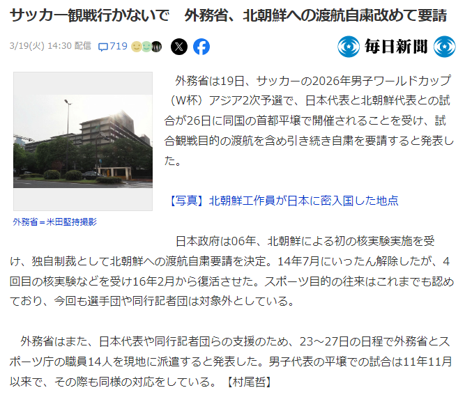 外務省は19日、サッカーの2026年男子ワールドカップ(W杯)アジア2次予選で、日本代表と北朝鮮代表との試合が26日に同国の首都平壌で開催されることを受け、試合観戦目的の渡航を含め引き続き自粛を要請すると発表した。