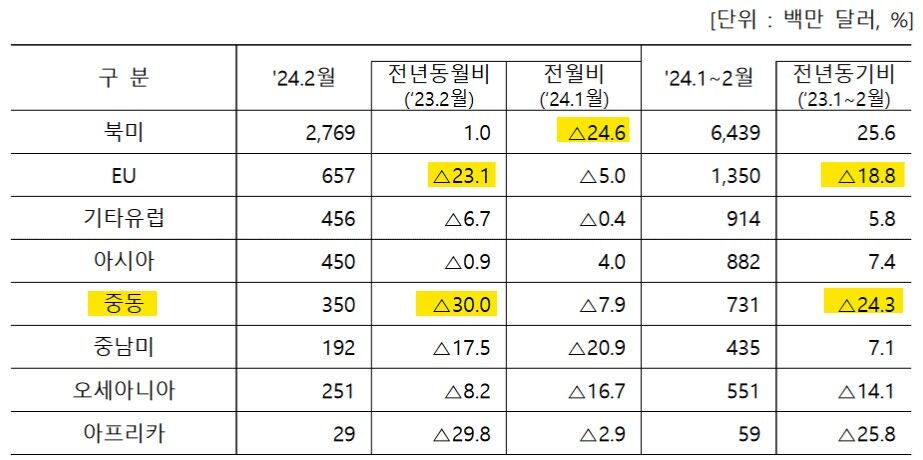 Money1でも何度かご紹介しているとおり、韓国の自動車輸出はもはや北米頼みです。その対北米輸出はなんとか対前年同期比で「+1.0%」ですけれども、前月の2024年01月と比較して「-24.6%」と、ほぼ1/4減少しました。