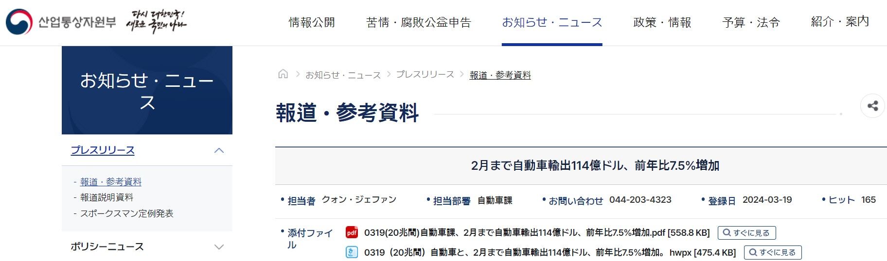 ⇒参照・引用元:『韓国 産業通商資源部』公式サイト「02月まで自動車輸出114億ドル、前年比7.5%増加」