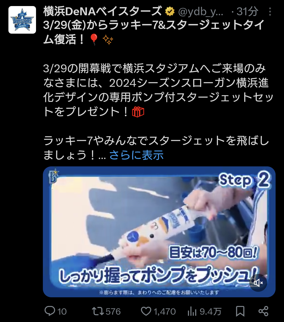 3/29の開幕戦で横浜スタジアムへご来場のみなさまには、2024シーズンスローガン横浜進化デザインの専用ポンプ付スタージェットセットをプレゼント!🎁