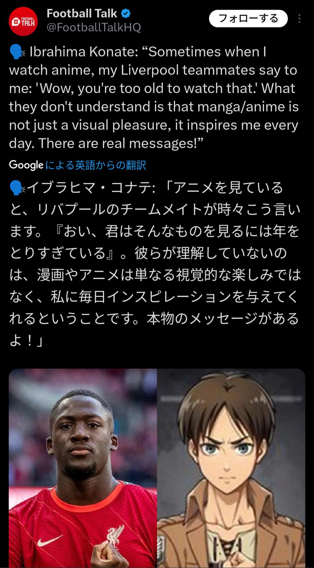 【悲報】リバプール選手「アニメは子供が見るものでしょw、いい歳こいてそんなの見てるのは恥ずかしいよw」大炎上