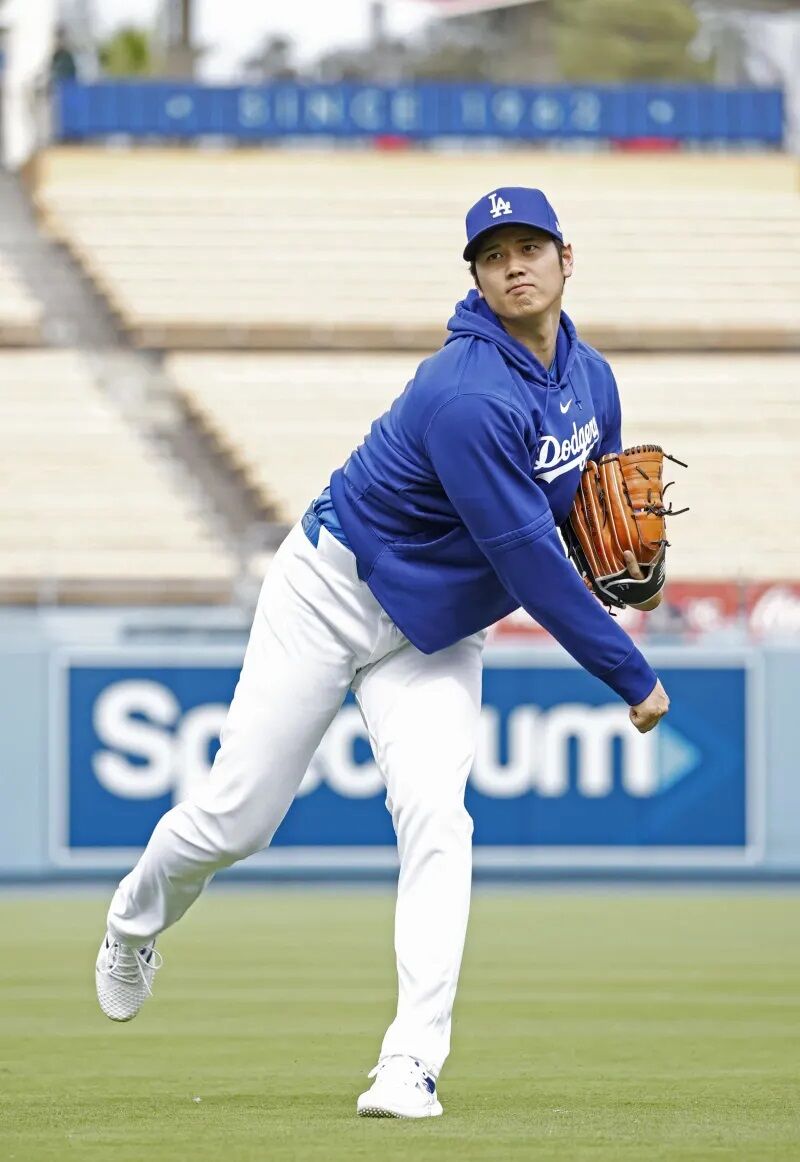 声明発表を終え、グラウンドでキャッチボールする米大リーグ、ドジャースの大谷翔平選手=25日、ロサンゼルス(共同)