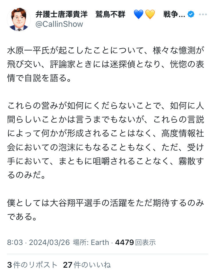 — 弁護士唐澤貴洋 鷲鳥不群 💙💛 戦争反対 ウクライナに平和を。Мир в Украине. (@CallinShow) March 25, 2024
