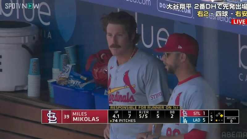 マイコラス 4.1回 7安打 2本塁打 5三振 2四球 5失点 5自責点 防御率10.38