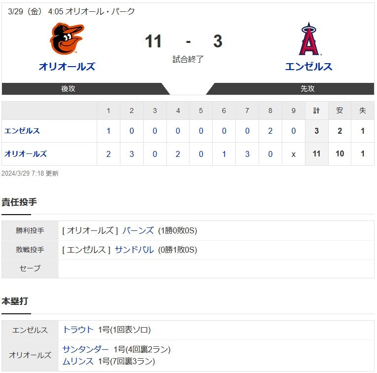 エンゼルス・トラウト、ホームラン。なおエンゼルスは3-11で敗戦
