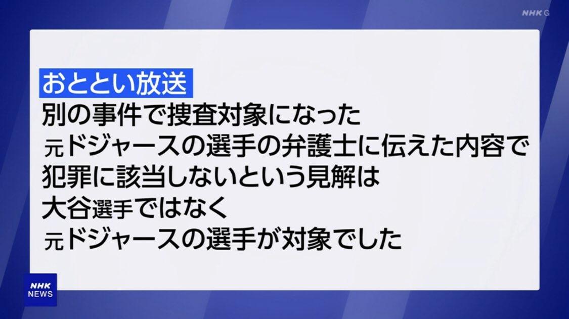 【悲報】NHK「大谷選手が犯罪捜査対象ではないというのは誤報でした」