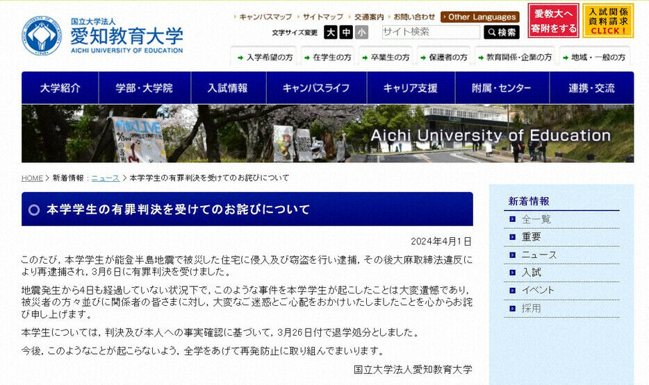 愛知教育大は1日、在学していた男子大学生を退学処分にしたとホームページ上で公表した。