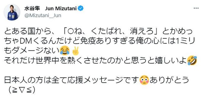 とある国から、「○ね、くたばれ、消えろ」とかめっちゃDMくるんだけど免疫ありすぎる俺の心には1ミリもダメージない