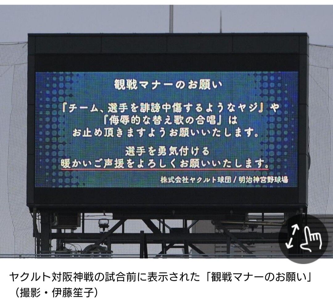 ヤクルトvs阪神戦で神宮球場が観戦マナーのお願い 『誹謗中傷するようなヤジ、侮辱的な替え歌の合唱はお止め頂きますよう』