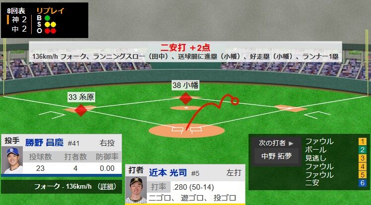 【中日対阪神1回戦】阪神、8回2アウト2,3塁から近本の2点タイムリー内野安打で同点に追いつく!!!!!!!!!!!
