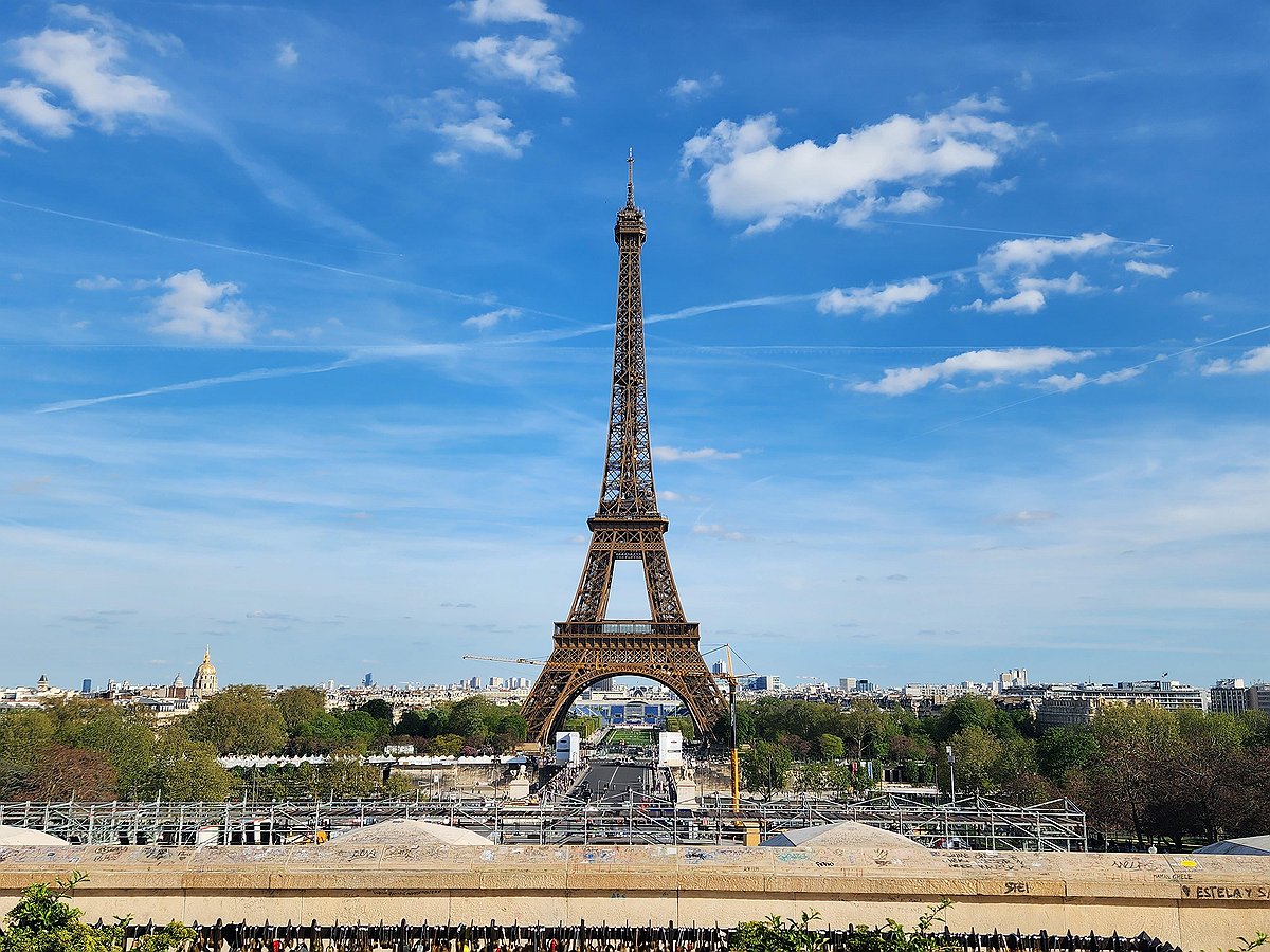 エッフェル塔の足元の広場では、パリ五輪のためのチャンピオンズパークの設置が進んでいる=(聯合ニュース)