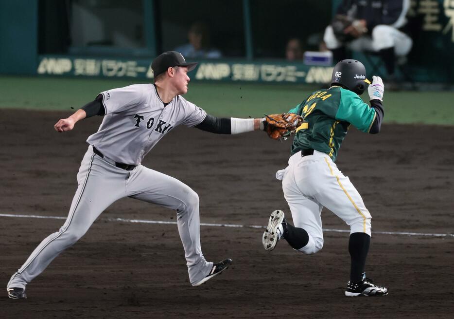 1点リードの七回1死二塁。投ゴロで飛びだした二塁走者の植田を二、三塁間の挟殺プレーに持ち込んだ。山崎伊からボールを受けた三塁手・坂本は植田を二塁方向へ追い込みながら、二塁ベースに到達しようとした打者走者の木浪もアウトにしようと二塁へ送球。だが、この送球間に植田は三塁へ突進。結果的に植田、木浪ともにアウトにできず、オールセーフとなった。この後、糸原の犠飛で同点とされた。