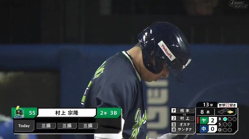村上 宗隆 .261 1本塁打 2打点 出塁率.452 長打率.348 OPS.799