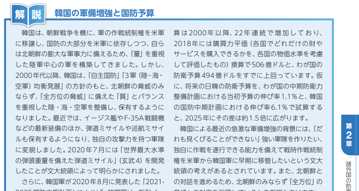 韓国の国防予算の急な引上げについて「2021防衛白書」は、「《誰も見くびることができない》強い軍隊を作りたい、独自に作戦を遂行できる能力を備えて戦時作戦統制権を米軍から韓国軍に早期に移管したいという文大統領の考えがあるとされています」と指摘している。