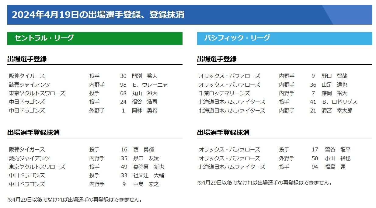 【4/19公示】巨人・ウレーニャ、中日・岡林、日本ハム・清宮らが一軍登録 巨人・泉口、ヤクルト・嘉弥真、中日・中島らが登録抹消