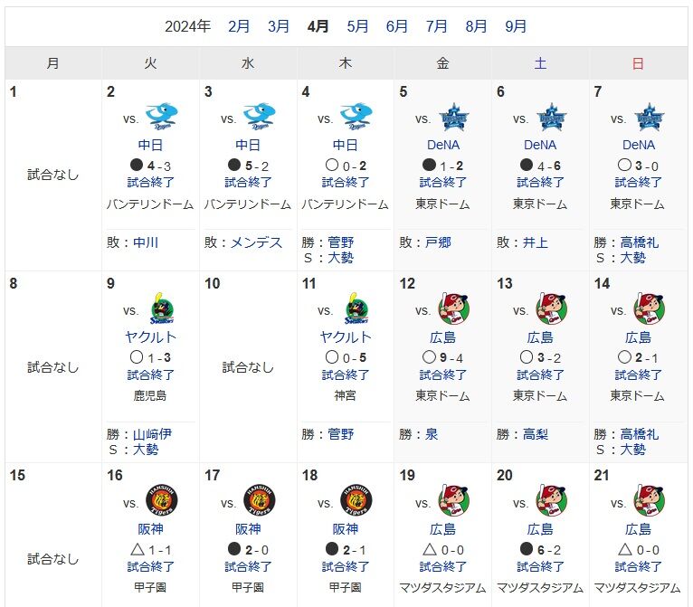 読売巨人先週は一つも勝てず