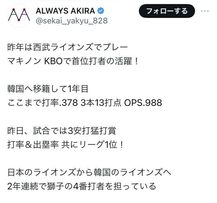 【朗報】元西武マキノン、韓国で首位打者.378 3本 OPS.988