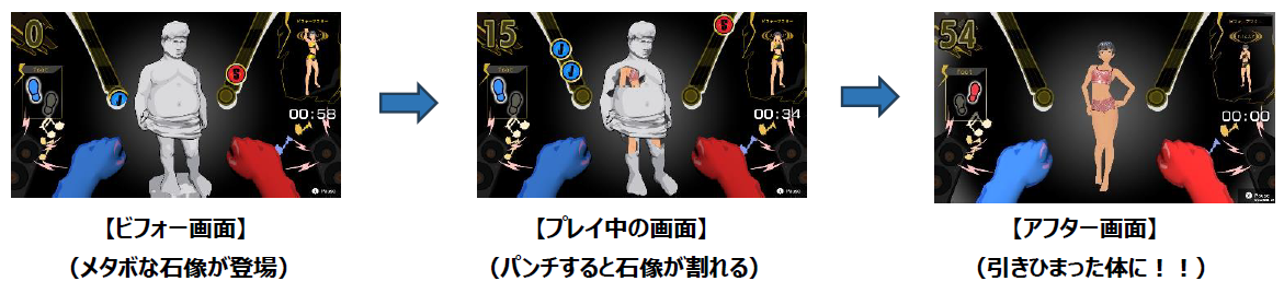 1日の締めくくりとして、思いきりパンチすることで今日のストレスを発散するとともに、有酸素運動で気持ち良く発汗させるゲーム(ゲーム名「ビフォーアフター」)が発動します。