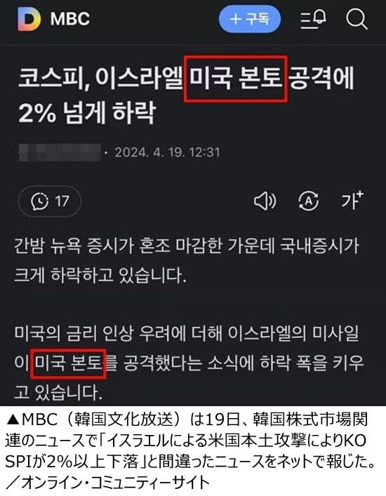 MBCは今月19日「KOSPI(韓国総合株価指数)がイスラエルによる米本土攻撃で2%以上下落」という見出しのオンライン報道で「米国の金利引き上げへの懸念に加え、イスラエルのミサイルが米本土を攻撃したとのニュースで下げ幅が拡大している」と報じた。