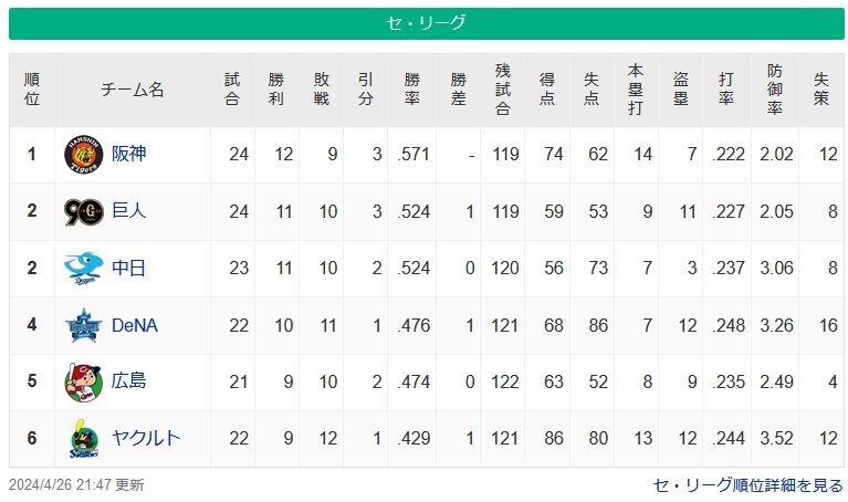【4/26】●●●東京●広島●横浜 中日○読売○阪神○○○