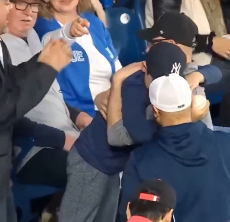 ジャッジのホームランボールをゲットしたおじさん、ヤンキースファンの子供にボールをあげる