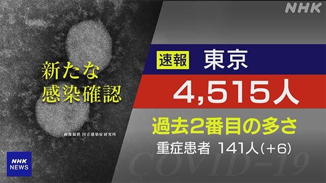 東京都は6日、都内で新たに4515人が新型コロナウイルスに感染していることを確認したと発表しました。都内では5日、これまでで最も多い5042人の感染が確認されていて、6日の4515人は5日に次いで過去2番目の多さです。また、4000人を超えるのは3日連続です。