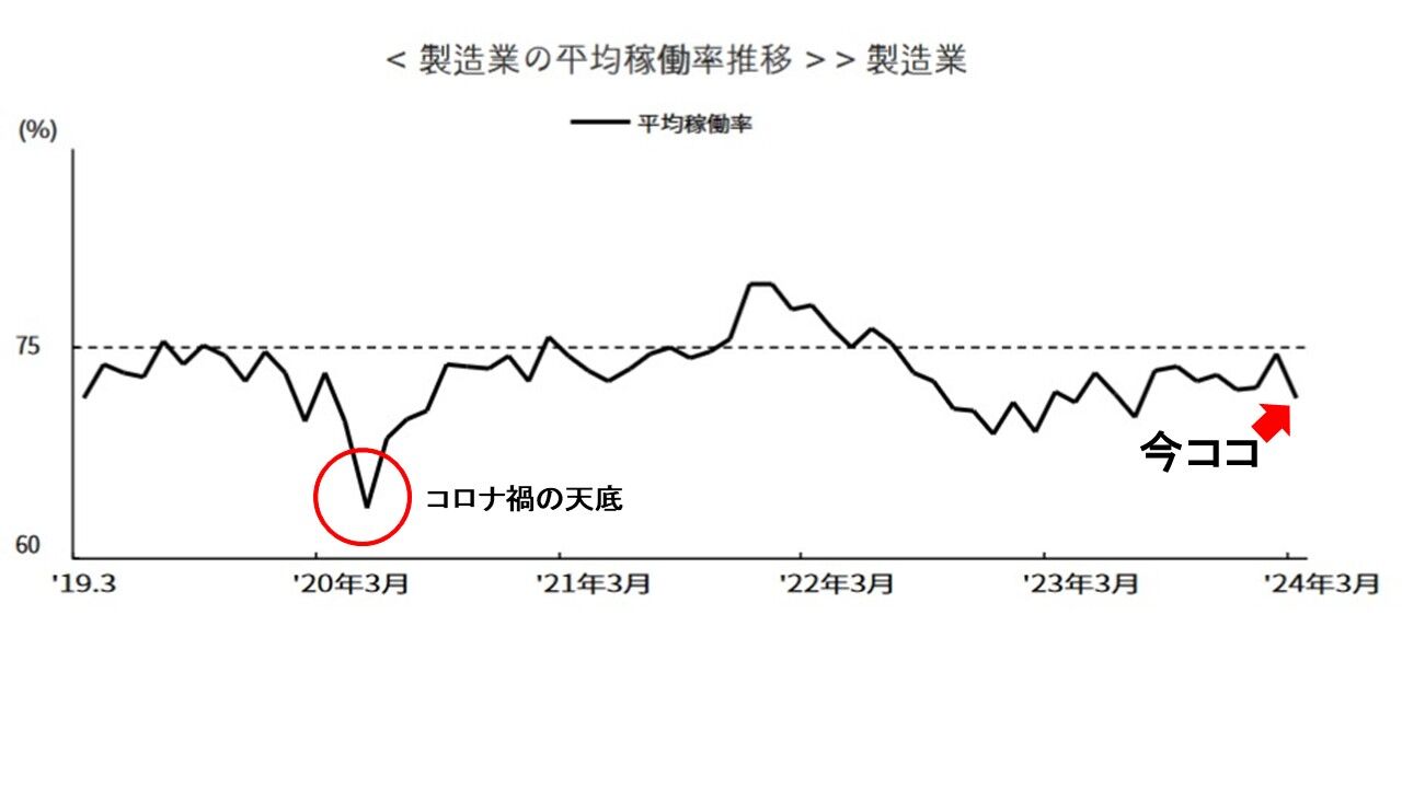 製造業の稼働率ですが、また下落方向に転じています。