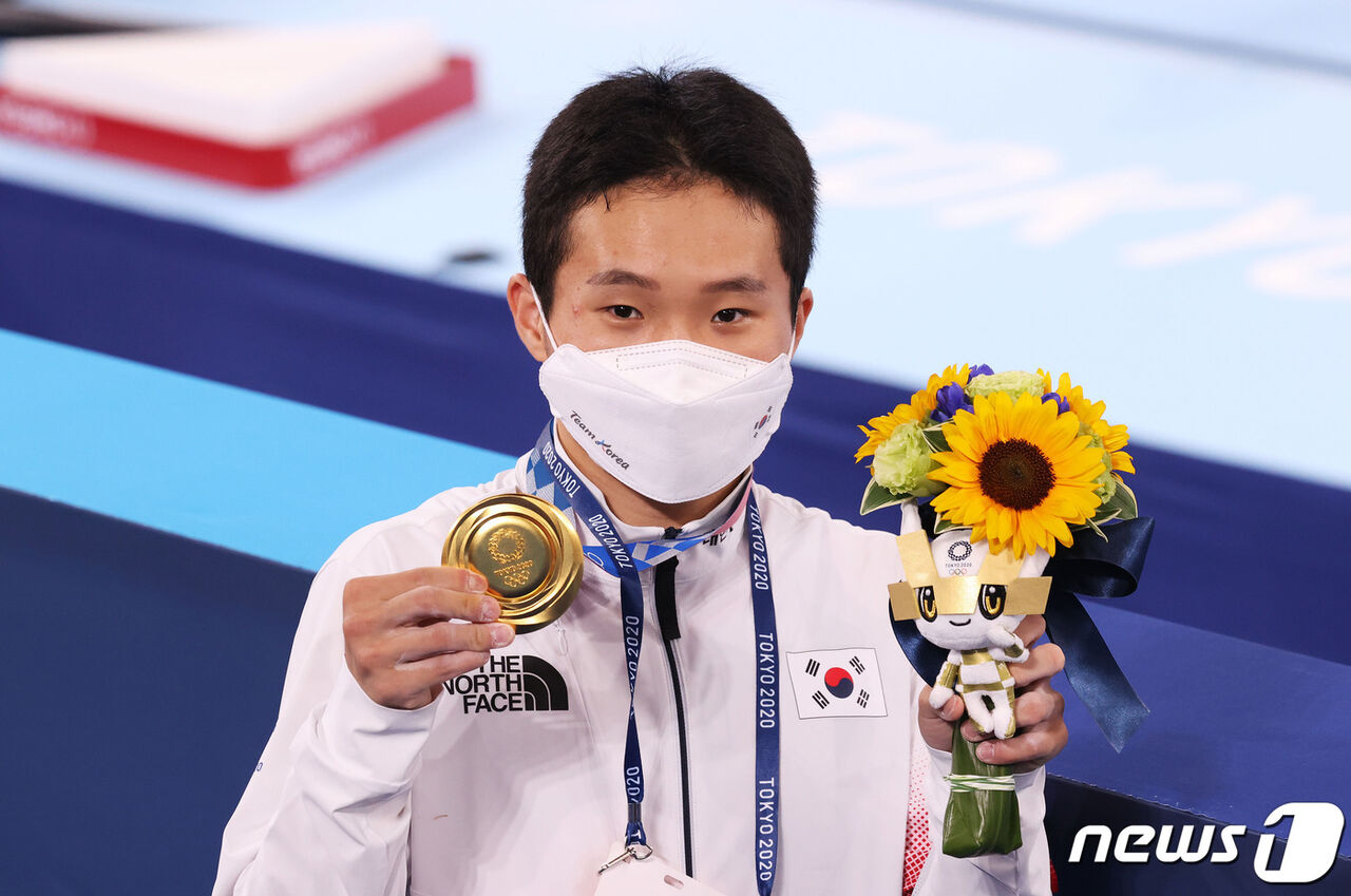 大韓民国体操シン・ジェファンが2日午後、東京・有明体操競技場で行われた「2020東京オリンピック」男子跳馬決選で、金メダルを首にかけて喜んでいる。シン・ジェファンは、1回目と2回目で平均14.783点を獲得して、金メダルを首にかけた。
