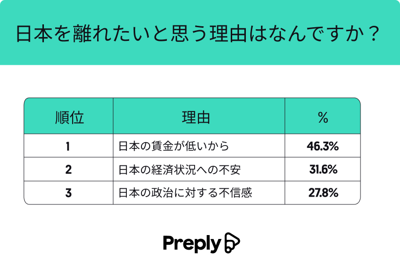 日本の若者の「海外移住願望」を調査 「日本を出て海外に移住したい」という若者は40%を超える日本を離れたいと思う理由を尋ねたところ、1位は「賃金が低いから」でした。続いて2位は「日本の経済状況への不安」でした。円安などの状況から、今後の日本経済に不安を感じている若者も多いようです。