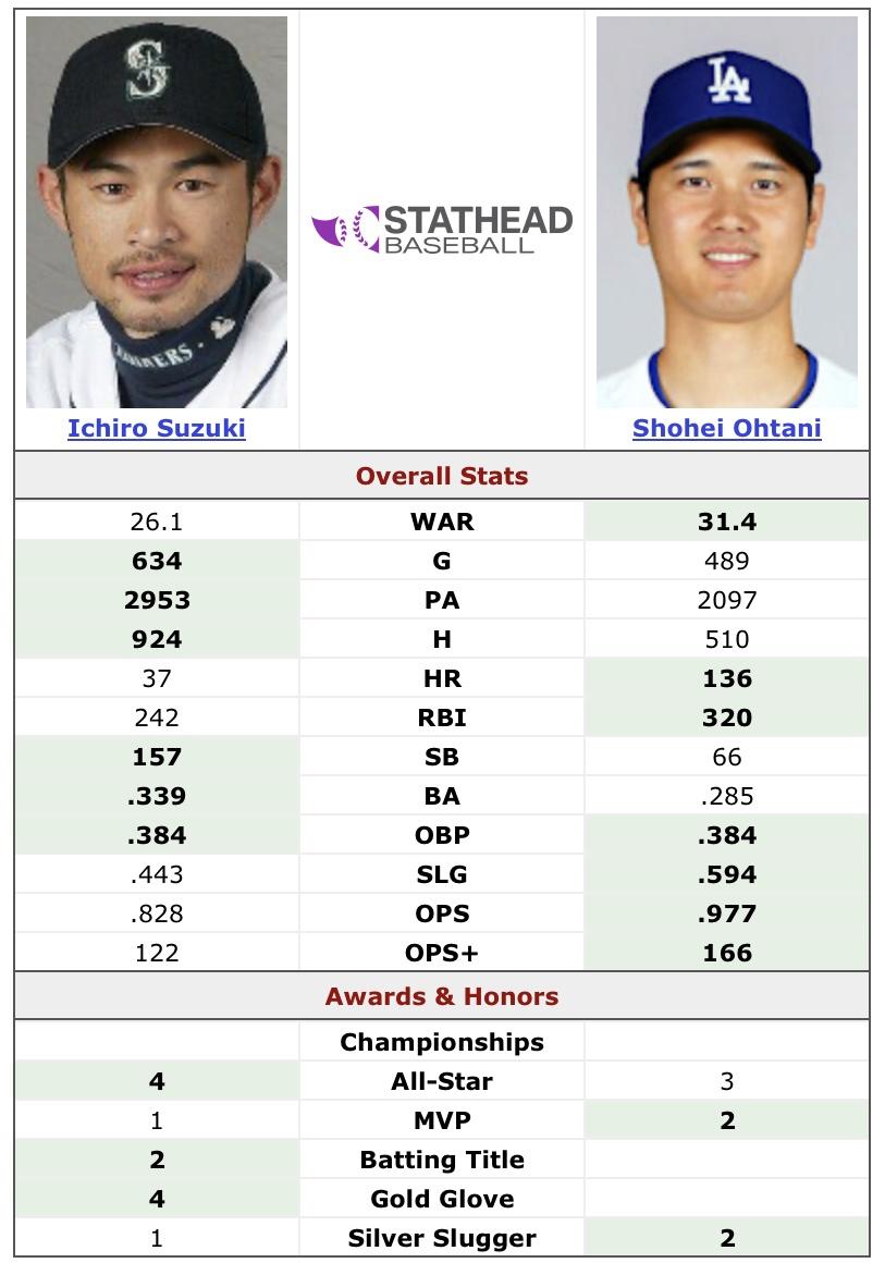 イチローの2001〜2004年と大谷の2021〜2024年の同じ4シーズンでの成績比較や