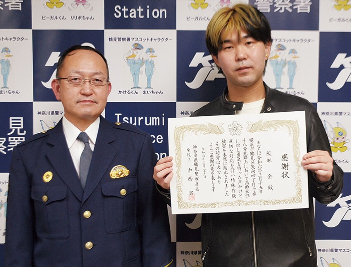 同容疑者は3月、横浜市の路上ですれ違った高齢女性の携帯電話の通話から特殊詐欺を疑って110番し、神奈川県警から感謝状を受け取っていた。