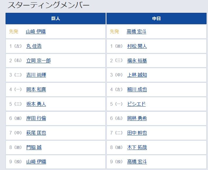 【巨人対中日10回戦】2(右) 立岡 宗一郎 6(捕) 岸田 行倫