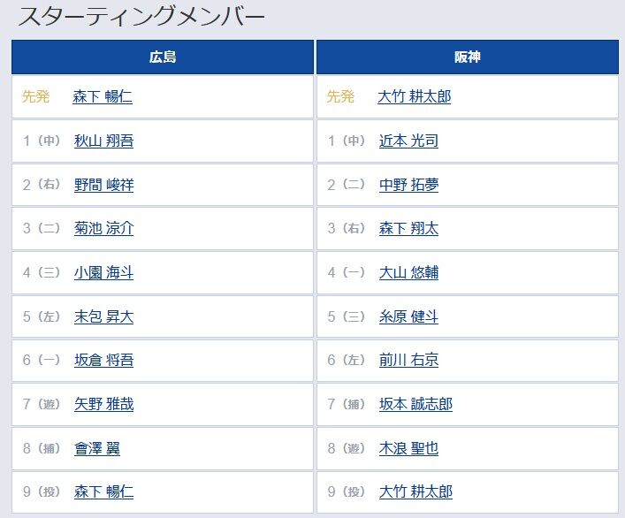 【広島対阪神9回戦】5(三) 糸原 健斗 6(左) 前川 右京