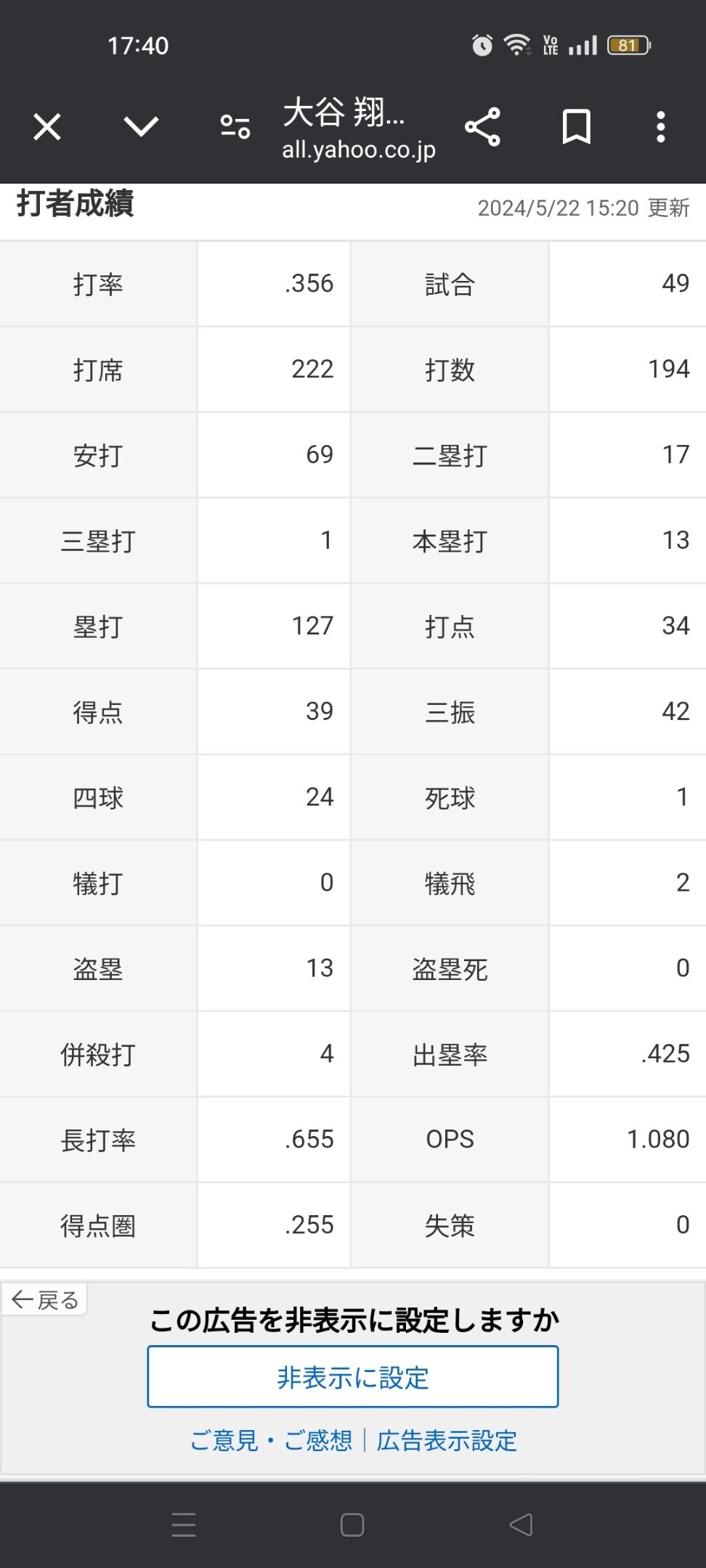 大谷翔平「打率.356(194-69)13本 34打点 OPS1.080 盗塁13(13-13)」←これについての率直な感想www