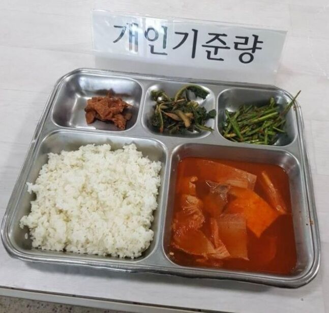 Aさんが公開した写真を見ると、給食のトレイに盛りつけられているのはご飯、ニラのあえ物、大根の若菜のキムチ、そして少量の豚肉がすべてだ。
