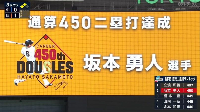 【巨人対中日11回戦】巨人・坂本勇人が史上2人目の偉業 通算450二塁打達成