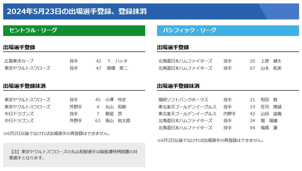 【注】東京ヤクルトスワローズの丸山和郁選手は脳振盪特例措置の対象選手となります。